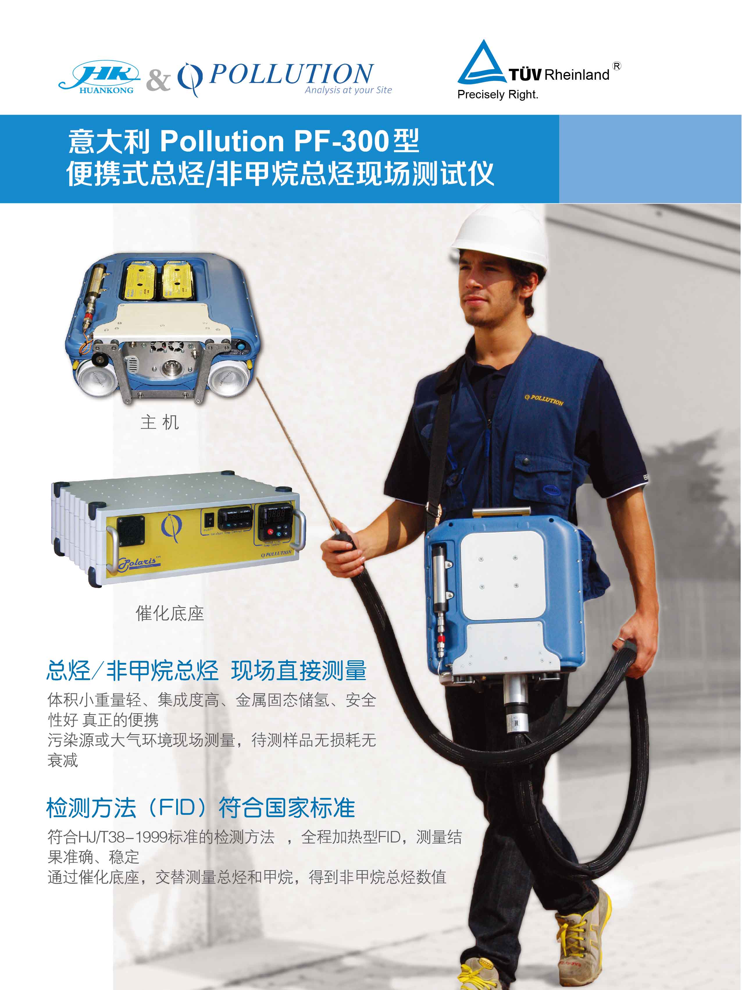 意大利Pollution公司生產的PF-300便攜式可揮發性有機物測試儀,采用符合EN13526、EN12619、EPA Method 25A、HJ/T38-1999標準的氫火焰離子化檢測器(FID)檢測技術, 測量氣體中的總烴/非甲烷總烴,可廣泛用于固定污染源煙氣排放、熱反應器和燃燒裝置排放、汽車尾氣排放、天然氣、環境空氣甚至包括醫療行業麻醉氣體的監測等。PF-300測量非甲烷總烴除需要采用全程加熱FID技術的主機外,還配置高溫催化裝置。主機測得總烴值,配合高溫催化裝置測得甲烷值,兩者的差值即是非甲烷總烴數值。PF-300是一款真正意義上的輕便、緊湊、安全性好、使用方便的便攜式現場非甲烷總烴測試儀。